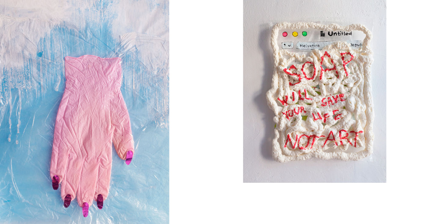 ’’Den digitale verden er en del af vores daglige rum, og i en tid med selvisolering er dette blevet åbenlyst. Et computerskrivebord, der overføres til et fysisk rum, er lige så meget en del af værkstedet som et lærred med maling. De komponenter, der udgør et projekt: polyethylen, poser, papir, plast, hvor mad og tøj leveres, er også en del af den nye hverdag. Jeg vælger disse materialer og fokuserer ikke på deres æstetiske kvaliteter, men på det faktum at de udgør min virkelighed.’’