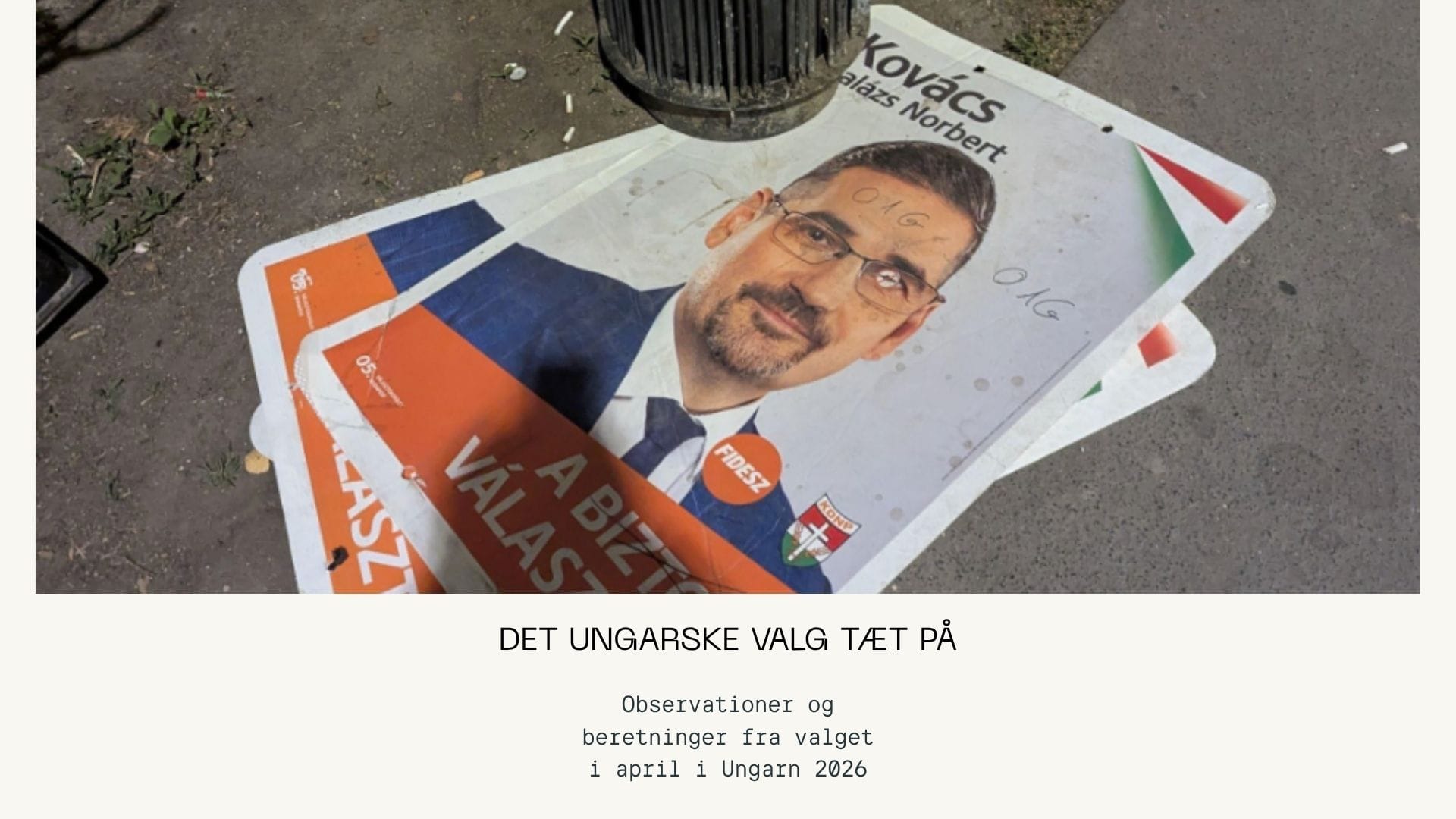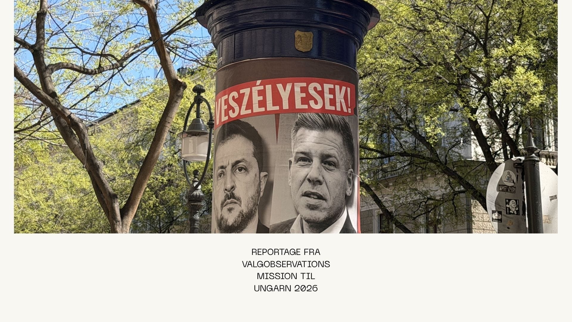 På vej med bus fra lufthavnen den 8. april bliver vi hurtigt mødt af den første valgplakat. Selvom den er betalt af regeringspartiet Fidesz, forestiller den ikke Ungarns magtfulde premierminister Viktor Orbán. I stedet ser man et lidet flatterende sort-hvid-portræt af oppositionens leder, Péter Magyar, i selskab med en sammenbidt Volodymyr Zelenskyj. Skrevet af Jakob Hansen.